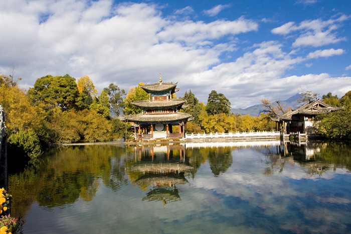丽江黑龙潭始建于乾隆二年(1737),其后乾隆六十年、光绪十八年均有重修记载。旧名玉泉龙王庙,因获清嘉庆、光绪两朝皇帝敕封“龙神”而得名,后改称黑龙潭。诗云:“泉涣涣兮涟漪,问何时最是可人?须领略月到天心,风来水面;亭标标而矗立黑龙潭公园,看这般无穷深致,应记取云飞画栋,雨卷珠帘。”黑龙潭以其天生丽质,名列《中国名泉》、《中国风景名胜》等书,诚不虚也。迎面见有一座涂金绘彩的牌楼,门口四尊石狮,肌理秀美,威武雄壮,过去守护木氏土司衙门,1966年迁此守护玉泉。进门往右,但见垂柳飘指,一潭澄碧,树底天光云影,树梢楼台隐现。沿潭右堤至锁翠桥,桥上古人有联云:“惊涛撼树飞晴雪,未雨垂虹卧曲波。”它生动地描绘了桥边景致。右边桥下三孔飞瀑,水花四溅,涛声如雷,流向古城,玉水河畔,杨柳依依,浓荫蔽日。往桥的左边黑龙潭公园看,一座五孔石拱桥,长虹卧波一般,将潭一分为二,玲珑俊美的一文亭、得月楼分别屹立内外潭心,四面临水,有桥与岸上相连。此楼始建于清光绪二年(1876年),楼名取自古人对联“近水楼台先得月、向阳花木早逢春”中三字。1963年重建时,郭沫若为该楼题写了匾额“得月楼”三字及两副对联。一副是集毛泽东诗词句: