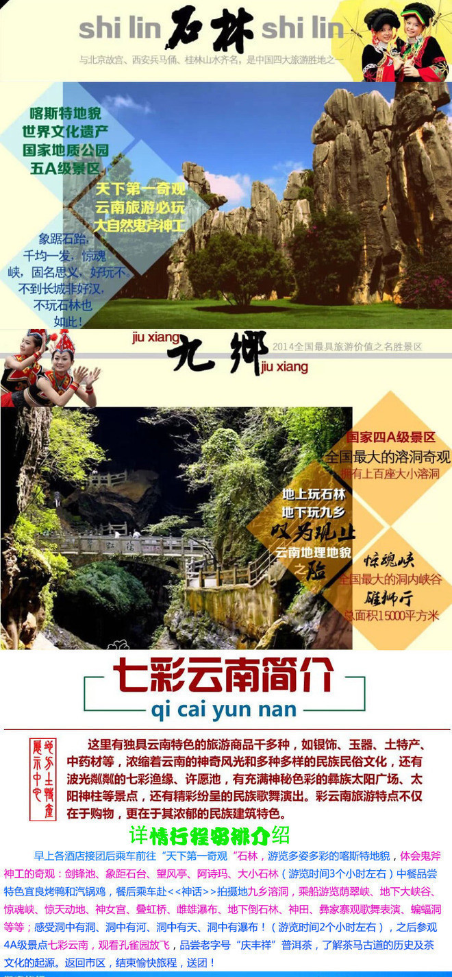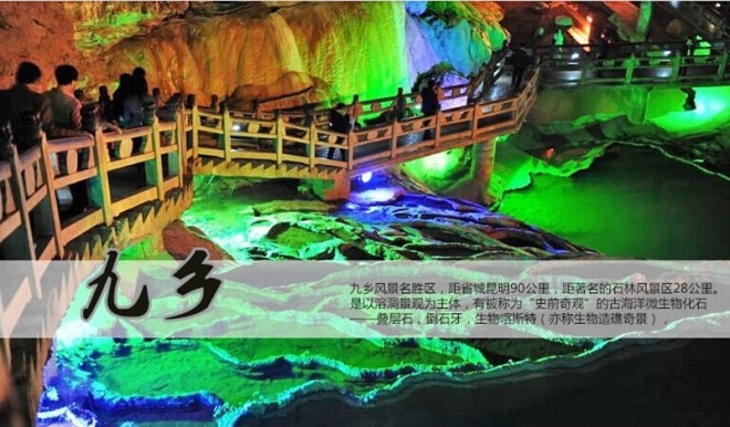 早乘车出发前往参观游览---石林风景区、景区环保车自理25元/人,体会鬼斧神工的“天下第一奇观”游览(大、小石林、双鸟渡食、象锯石台、千钧一发、望风亭、剑峰池、阿诗玛遗像)畅游2亿7千万年前浩瀚海洋之海底,一边漫步在世界最大的喀斯特地质公园:乃古石林、大叠水、长湖、月湖、芝云洞、奇风洞``等等组成;一边聆听阿诗玛的故事;(游览约150分钟)游览---九乡溶洞风景区(含游船、含索道)九乡溶洞群发源于六亿年前的古老白云岩中,总计有大小溶洞上百座,被称为溶洞之乡。乘船游览荫翠峡、地下大峡谷、惊魂峡、惊天动地、神女宫、叠虹桥、雌雄瀑布、地下倒石林、神田、彝家寨观歌舞表演、蝙蝠洞等等;感受洞中有洞、洞中有河、洞中有天、洞中有瀑布!后前往参观七彩云南,品尝高原茶艺,欣赏茶艺表演!后返回昆明19:30左右抵达昆明后散团结束旅程。